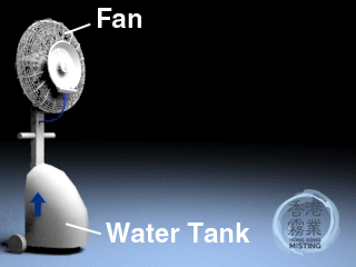 Our outdoor cooling fans basically combine a large fan with a cooling pad. Users need to fill up the water tank below, and the driving pump will boost up the water to the top and water will spread evenly on the cooling pad. In the meantime, a big fan will pull hot air in and will lead it through this wet cooling pad. The heat inside the air will be absorbed. Unlike a mist fan, the product emits no water droplets.